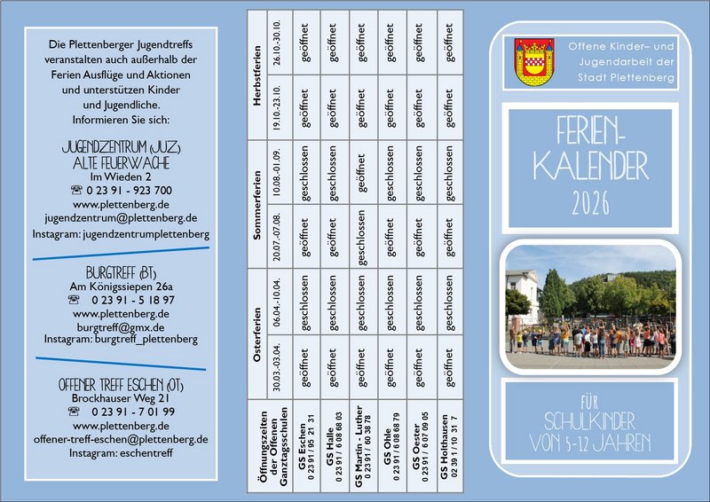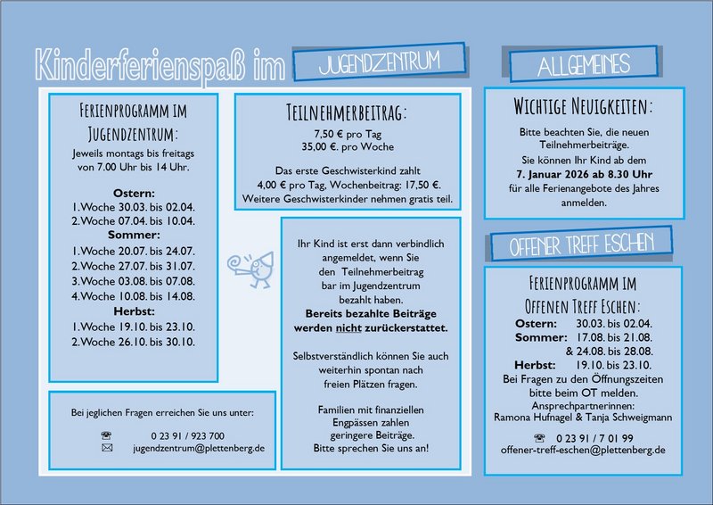 Die Stadt Plettenberg bietet in Zusammenarbeit mit dem Jugendzentrum Plettenberg eine Ferienbetreuung für Schulkinder im Alter von 5 bis 12 Jahren an.